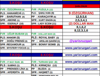 7.KOŞU : Son yarışında start makinesinin tamam viraj üzerinde olduğu 1600 metrede , start verildikten sonra dışından ve içinden rakipler hamle yapınca istediği pozisyonu alamayıp 6-7. liğe kalan (2) SILVER TYCOON yinede mücadelesini yaptı ve 4. oldu. Ben yarışını beğendim. Bu defa daha önce kazandığı pist ve mesafede uygun şartlar var. 35 günlük arasıyla bu yarışa tam hedef geldiğini düşünüyorum. İyi start alıp önlerde konumlamıp düzlükte de arttırarak kazanması benim adıma normal sonuç olur. Sabit Oranlı Ganyan oyunlarında ve altılı ganyan kuponlarımda BANKO olarak değerlendireceğim.8.KOŞU : Güney Afrika yarışlarında en çok sürprizin olduğu koşular handikap ve dişilere ait olan koşular . Yine zorluk derecesi yüksek bir yarış diyebilirim ancak burda biraz risk sevenler için özellikle belirteceğim iki safkan var ! Son yarışında yakın 7. olsada yarış içindeki görüntüsünü beğendiğim (5) THREAD OF LIFE ve yine son yarışında tüm düzlük mücadelenin içinde olup 4. olurken formunda gelişmeler gözlemlediğim (10) COLORAMA. Aradan gelecek isimler (4) BLUE PALACE , (2) IQEMBULABESIFAZANE ve (7) ICE CAP denk rakipler yanında kendilerine şans yaratabilirler. Yeri olanlar son yarışını ölçü almadığım (9) KOMESANS PASSION ve R.Fouire tercihiyle (3) COURAGEOUS ilave edilebilirler.