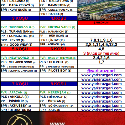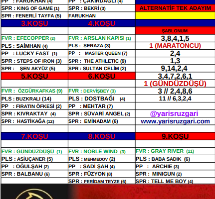 Twitter : @Cem10Mustafa Yarın Adana ikinci altılı için çalışmalarım bu şekilde. Umarım faydalı olur, herkese bol şans! 4.KOŞU: Burada benim çok öne çıkardığım bir