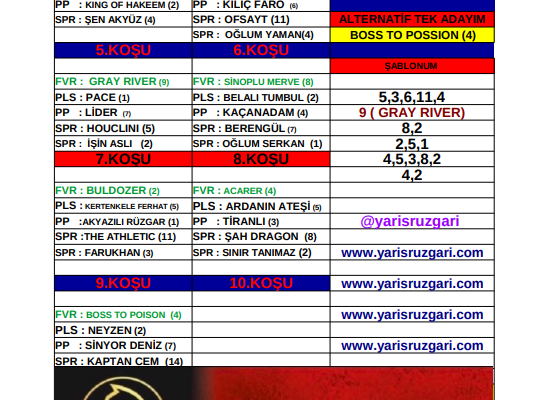 GRAY RIVER : Özellikle son yarışında ki performansıyla takip listeme aldığım bu isim için artık kazanacak bütün şartlar oluşmuş .Jokeyi startla birlikte ön grupta