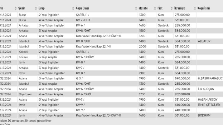 Türkiye Jokey Kulübü Aralık Ayı Yurt Dışı Takvimini Açıkladı. Listeye göre Aralık ayı yurt dışı yarış takviminde; ABD (32), Güney Afrika (25), Fransa (13), Avustralya (11), İngiltere (11), Hong Kong (7), Şili (7), BAE (4), Arjantin (1), Malezya (1), İrlanda (1) ve İtalya (1) olmak üzere 114 yarış