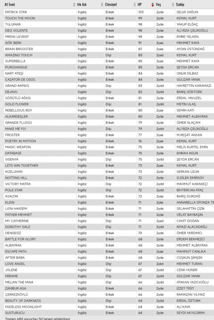 2024 yılının sonlarına doğru yaklaştığımız şu günlerde taylarda oluşan handikap puanları listesi aşağıdaki şekilde oluştu.